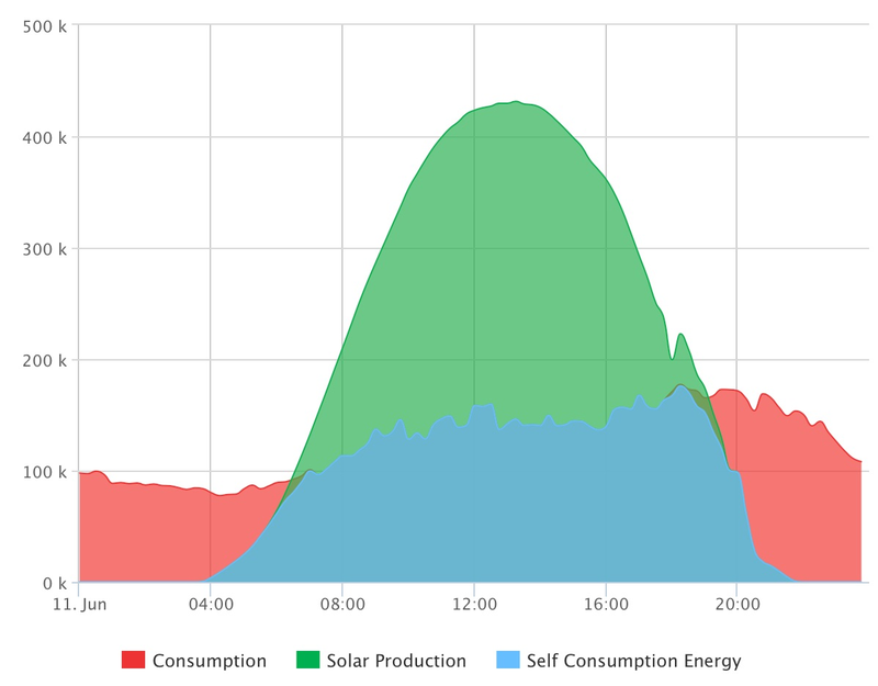 I diagrammet nedan ser du hur det ser ut en solig dag i juni. Den 11 juni producerade vi 4500 kWh. Vi var självförsörjande till 70% (blå) och sålde 2300 kWh (grön) och köpte 1000 kWh (röd). Vi har t o m 11 juni producerat över 615000 kWh.Vad mer händer under sommaren